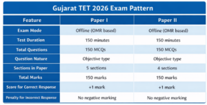 The Gujarat TET 2026 Exam Pattern consists of two papers: Paper I for Classes 1-5 and Paper II for Classes 6-8, each carrying 150 marks with 150 questions. The exam is conducted offline (OMR-based) with a duration of 150 minutes per paper and no negative marking.
