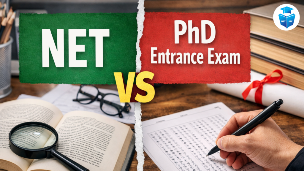 NET vs PhD entrance exam is a common source of confusion for aspirants who want to build a career in teaching or research. The both exam seem similar because they can lead to a PhD. NET vs PhD entrance exam purpose, benefits, and career options are very different. With the latest rules issued by the University Grants Commission between 2023 and 2025, UGC NET scores are now being accepted by many universities for PhD admission. And also, students no longer always need to appear for a separate university-level PhD entrance examination.