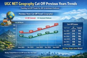 The UGC NET Geography Cut Off 2026 is expected to remain high due to increasing competition and consistent exam difficulty. With the General category JRF cutoff reaching 224 in December 2025, candidates should aim for a safe score above 220. By analyzing the category-wise cutoff, previous year trends, and the geography NET percentile score set by the National Testing Agency, aspirants can plan an effective strategy and improve their chances of qualifying for JRF and Assistant Professor positions.